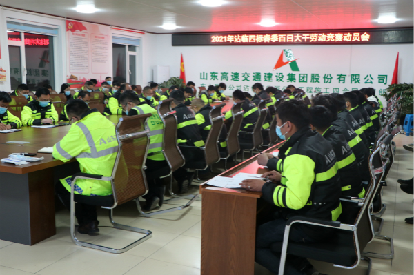 动员大会上,宣读了《山东高速交通建设集团股份有限公司2021年度“春季百日大干劳动竞赛”活动实施方案》,明确竞赛时间、目标等,动员全体参建人员通过开展以比质量管理、比安全管理、比进度管理、比党建、党风廉政建设、比综合管理为主要内容的劳动竞赛活动,大战百天,为年度目标任务打基础、筑根基。
