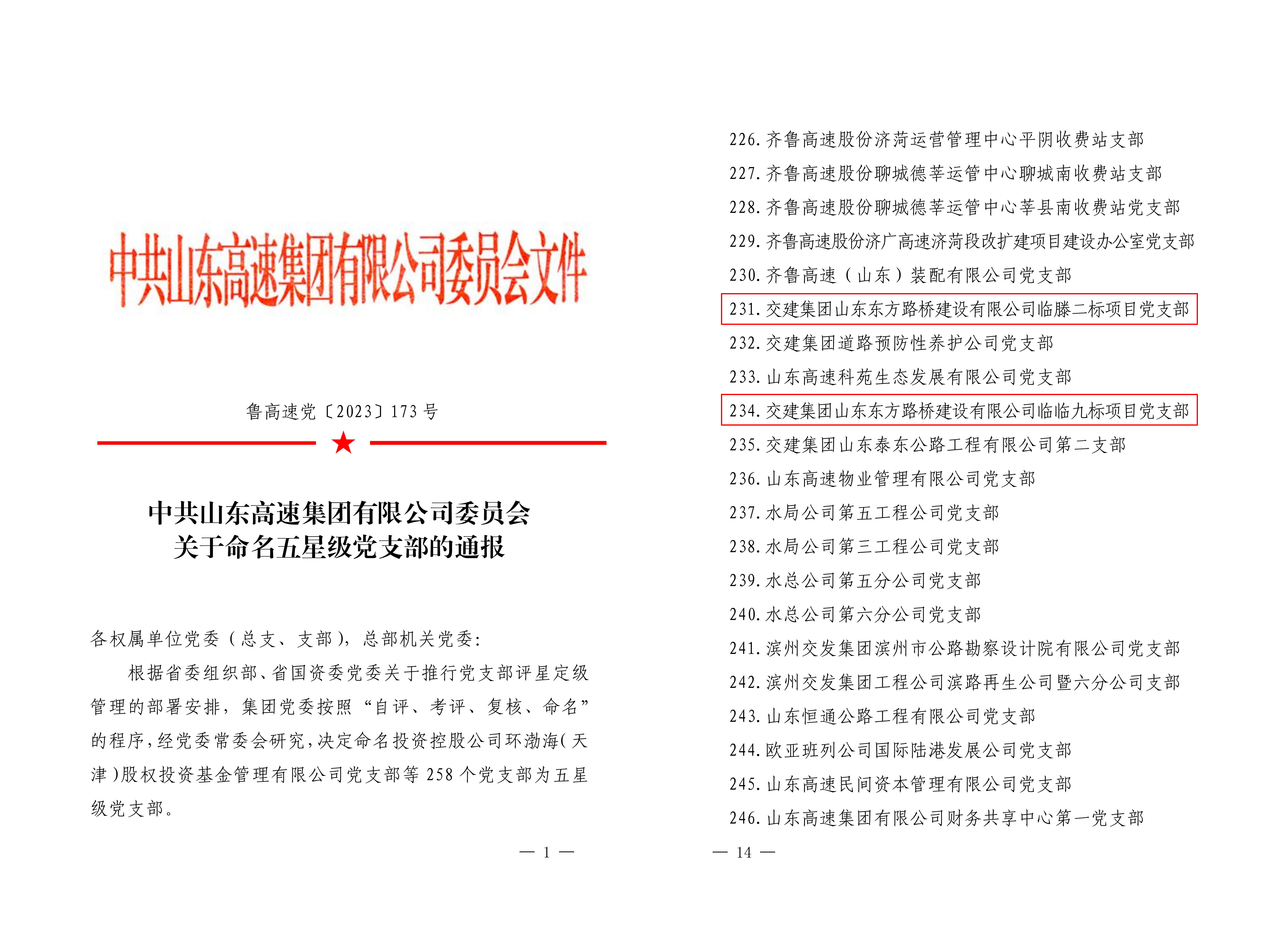 近日,中共山东高速集团有限公司委员会印发《关于命名五星级党支部的通报》,公司临滕二标、临临九标项目党支部荣获“五星级党支部”荣誉称号。