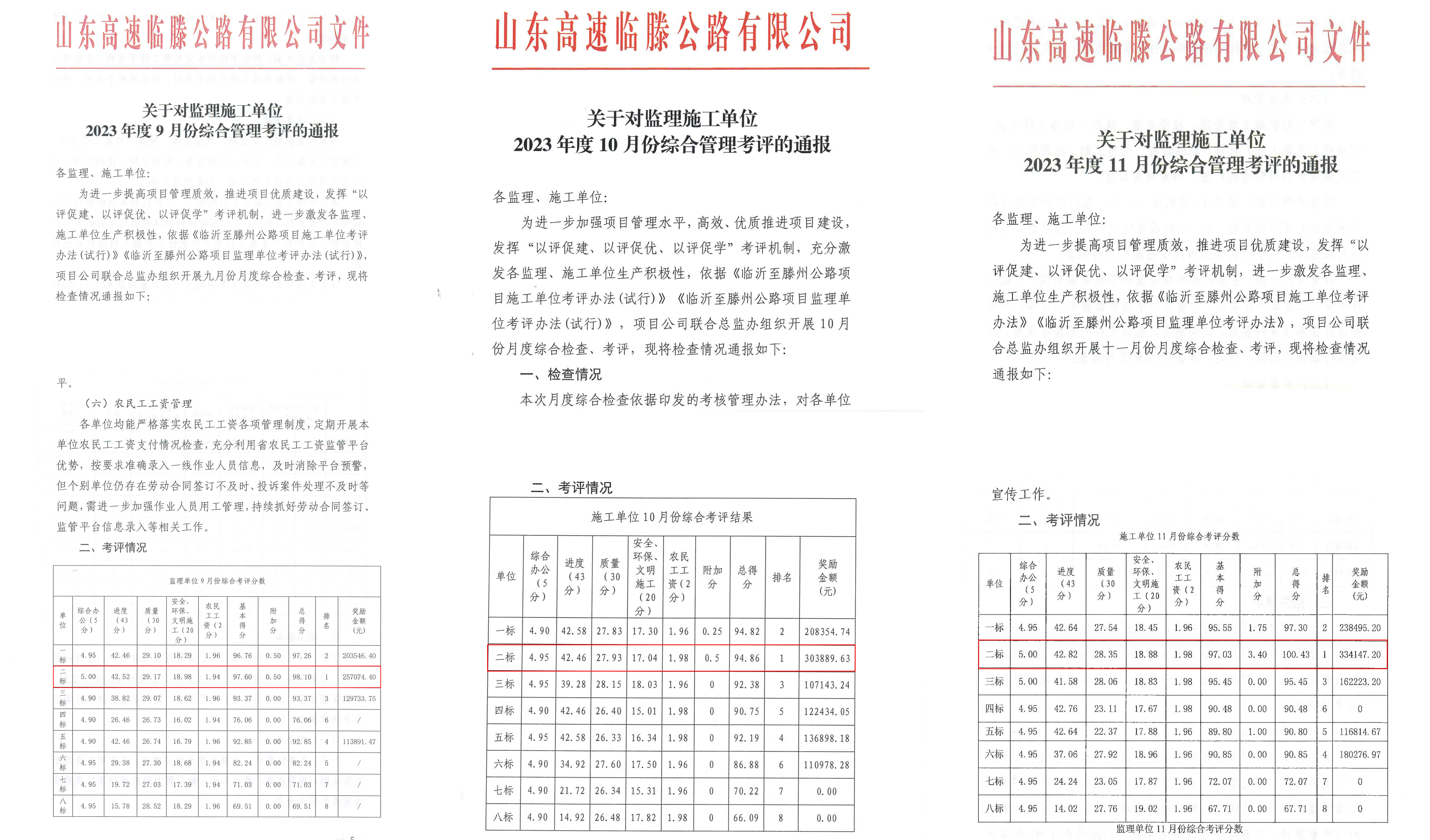 近日,东方路桥公司临滕二标项目在临滕高速项目公司组织的2023年度9、10、11月份月度综合考评中,连续3个月排名第一。