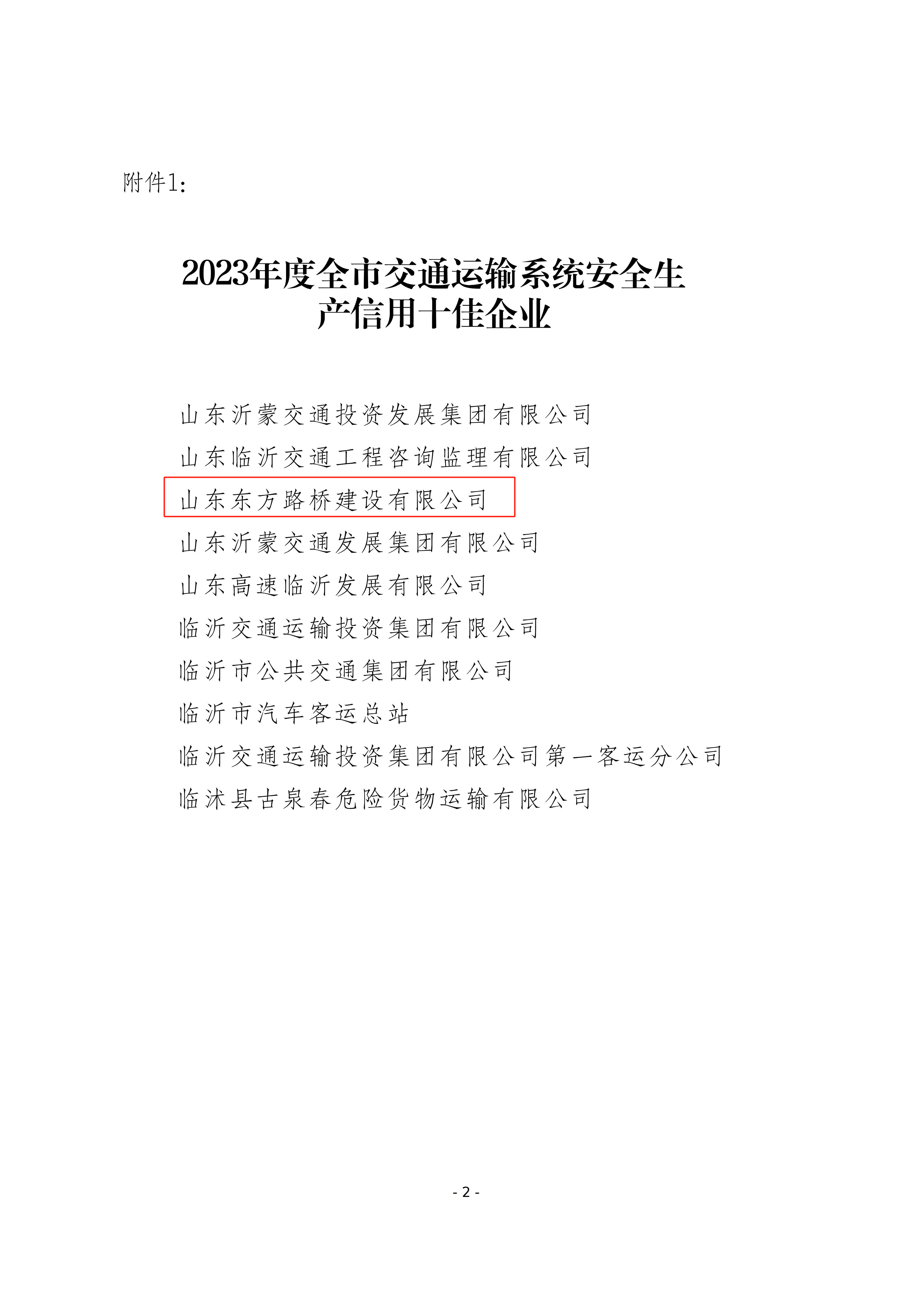 近日,在临沂市交通运输局组织的交通运输安全生产信用评价中,东方路桥公司荣获“2023年度全市交通运输系统安全生产信用十佳企业”称号。这是东方路桥公司继获评“山东省交通运输安全生产信用AA级企业”后取得的又一重要荣誉,推动安全生产治理能力和治理水平再上新台阶。
