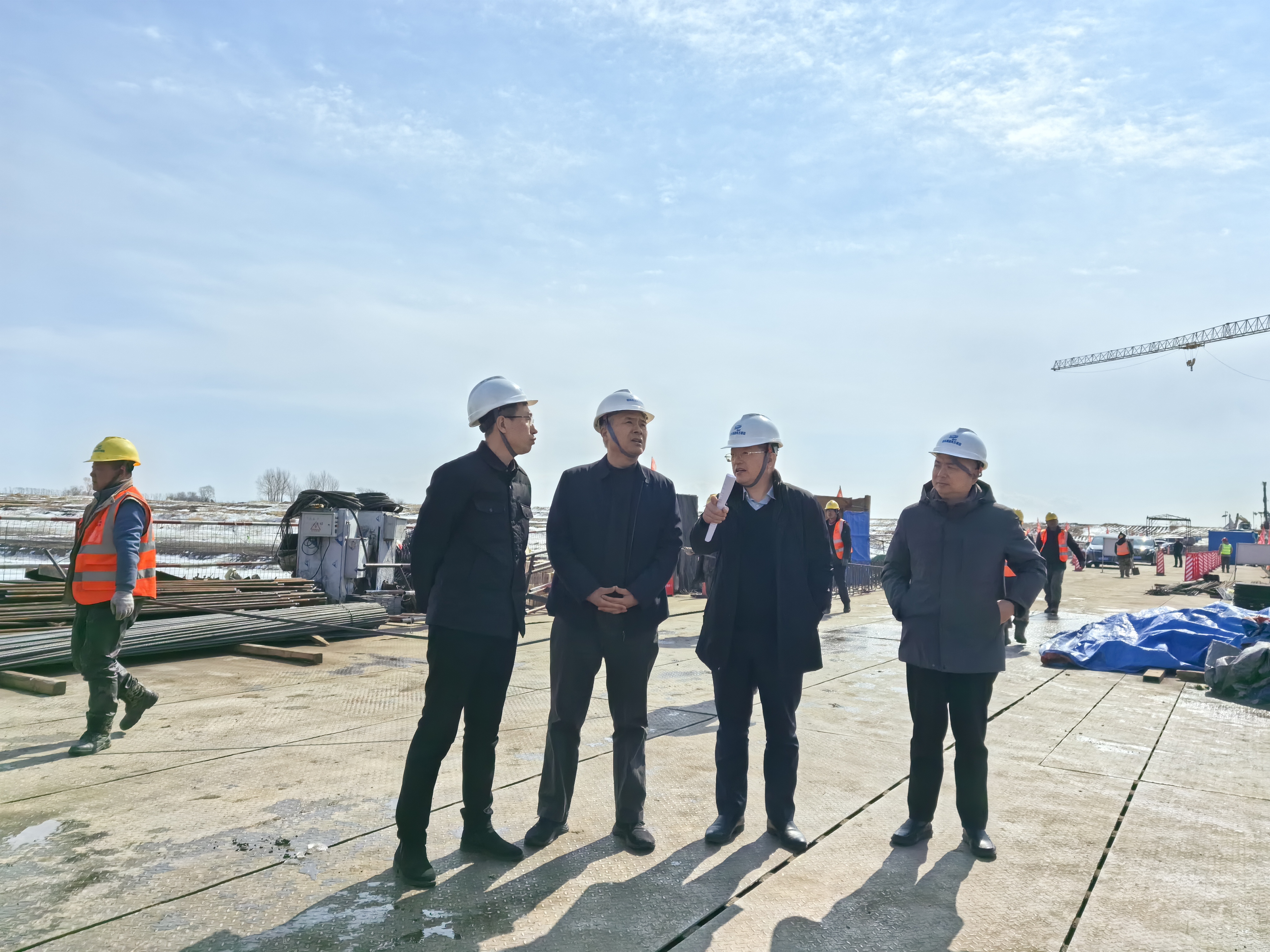 座谈结束后,刘贵翔一行前往交建集团承建的松花江特大桥项目施工现场,实地调研项目建设进展,听取项目负责人有关施工进度、技术质量及安全文明施工等情况的汇报,并对下一步工作提出要求。他强调:一是要加快主线梁场建设进度,10月份前完成预制任务,全力推进上部结构施工进度。二是保证冬季施工混凝土质量,并持续做好冰凌期、汛期的安全防护工作,确保栈桥、挂篮施工涉水及临边防护安全。三是紧抓施工黄金期,全面统筹资源配置,强化现场管控,高质量完成年度建设任务目标。