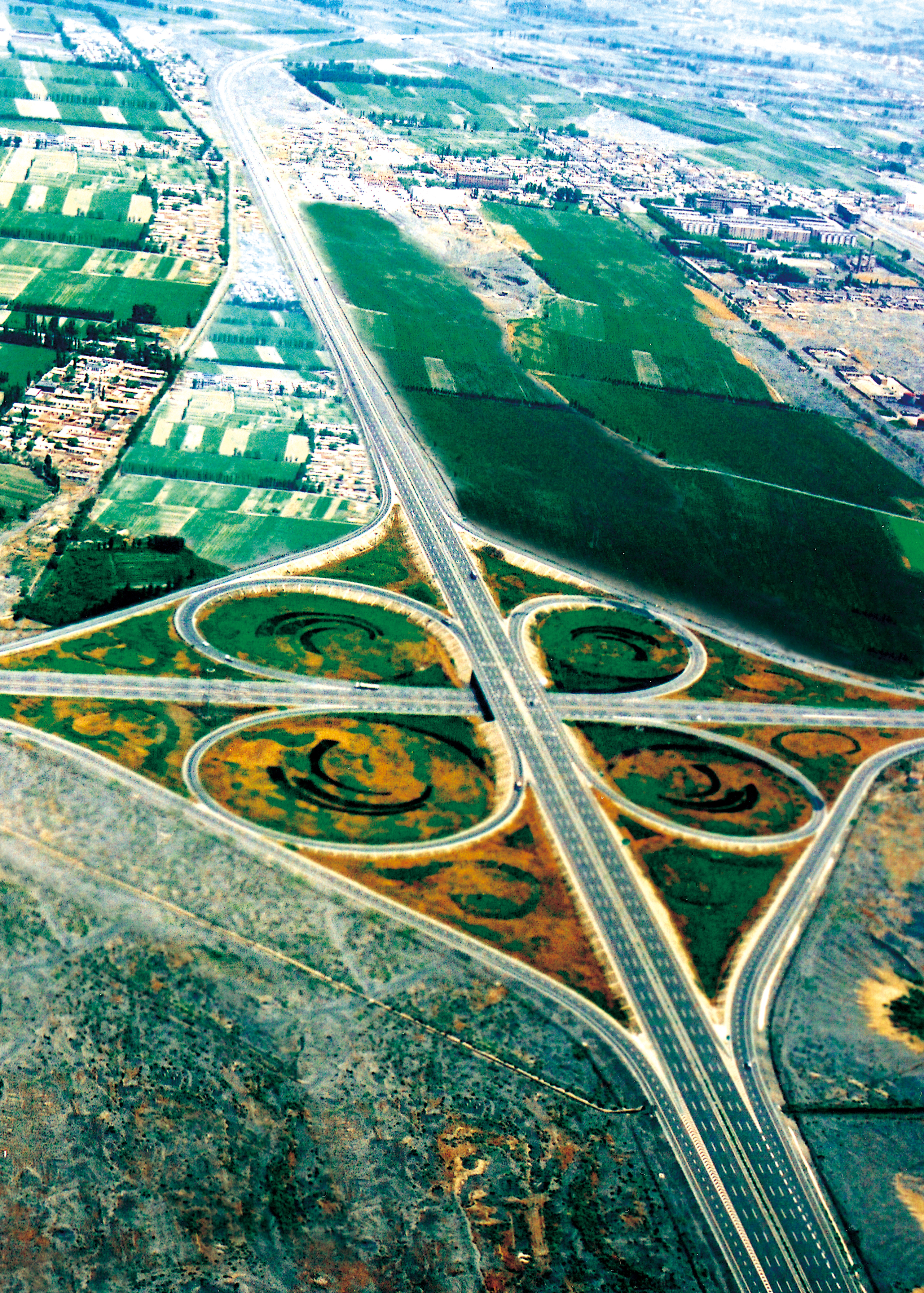 吐鲁番至乌鲁木齐至大黄山高等级公路,新疆第一条高速公路,公司承建了第六、七、八合同段,该工程2003年被交通部评为优质工程。图为上沙河立交区。