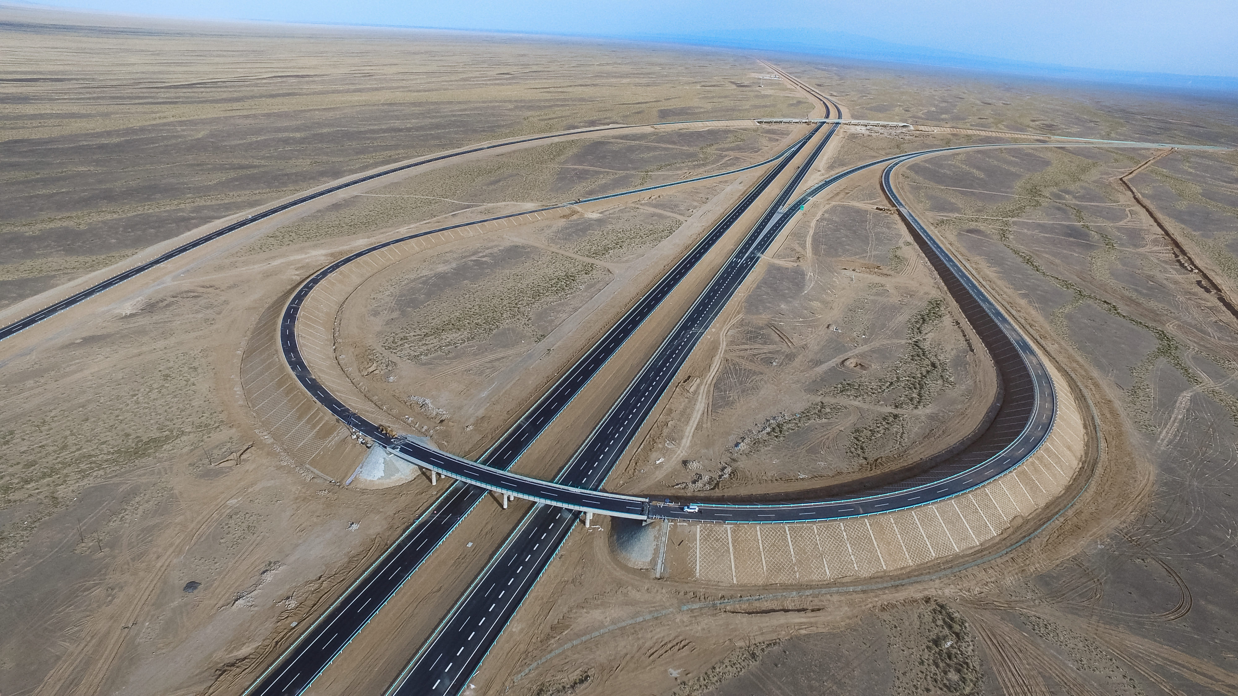 图为京新高速(G7)明水(甘新界)至哈密段,公司承建了第一、五标段,被誉为当今世界上最长的沙漠高速公路,获2018-2019年度“国家优质工程一等奖”