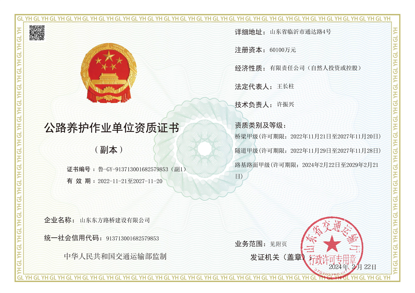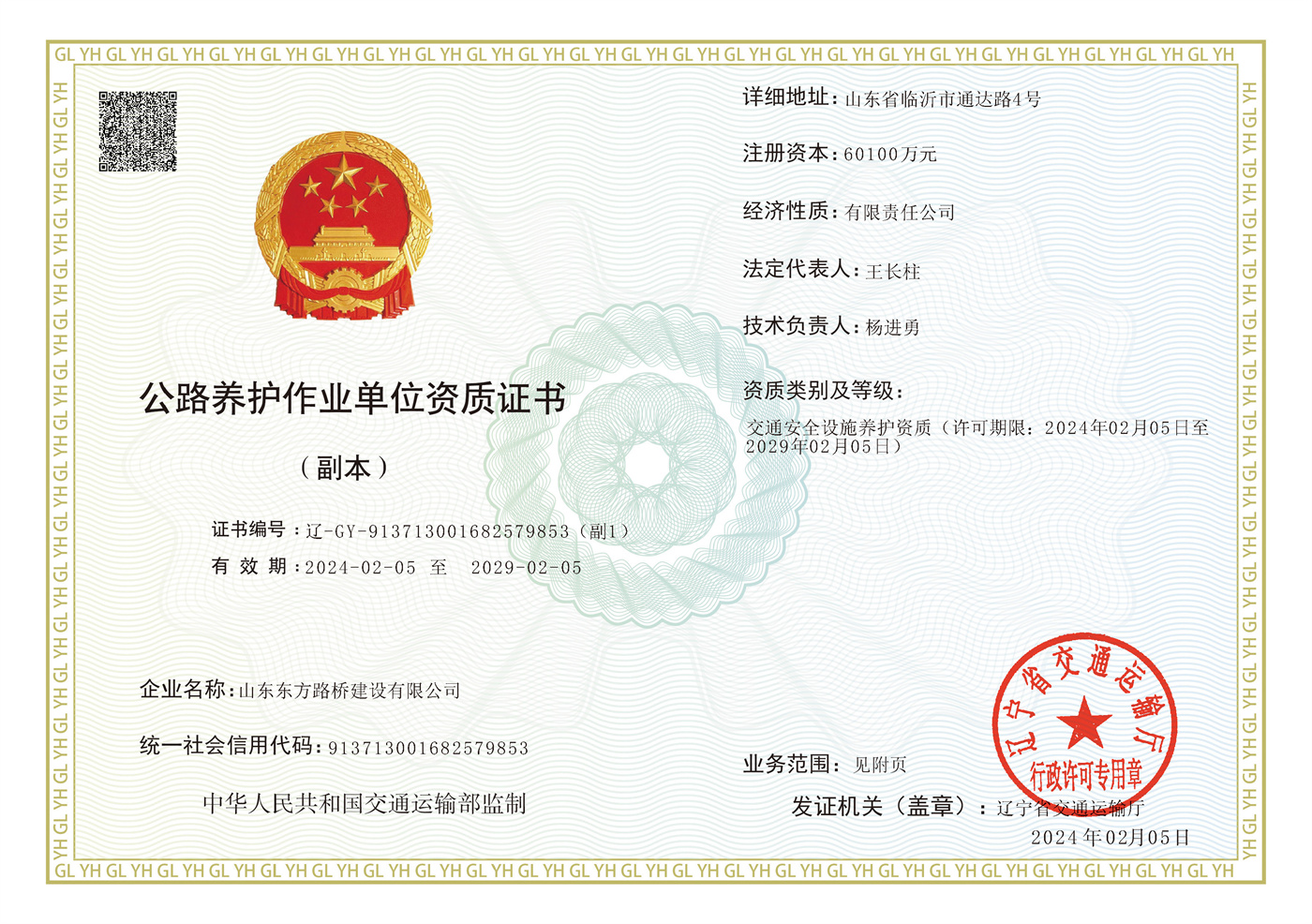 公路养护作业单位资质证书