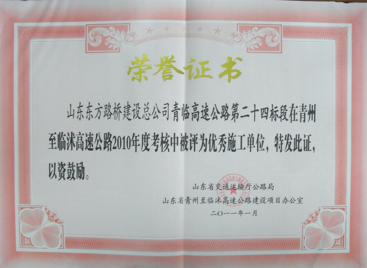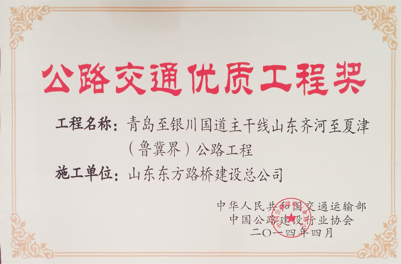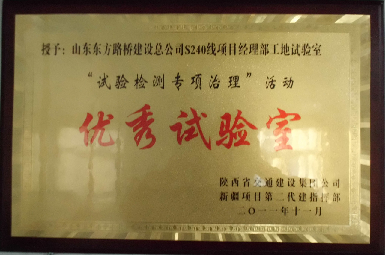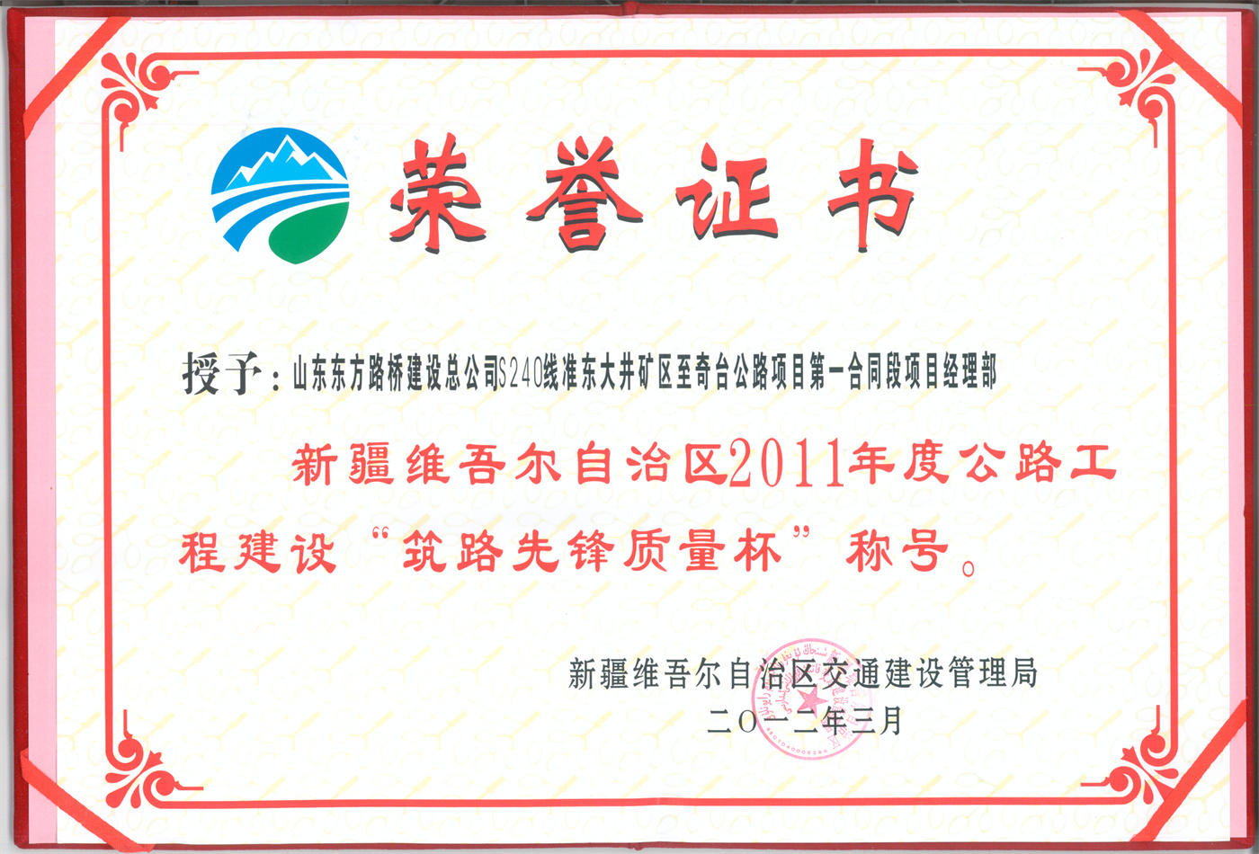 2011、2012年,新疆S240线准东大井矿区-奇台公路项目,公司承建了第ZQ-1标段,荣获新疆维吾尔自治区交通建设管理局颁发的“筑路先锋质量杯”荣誉称号 -