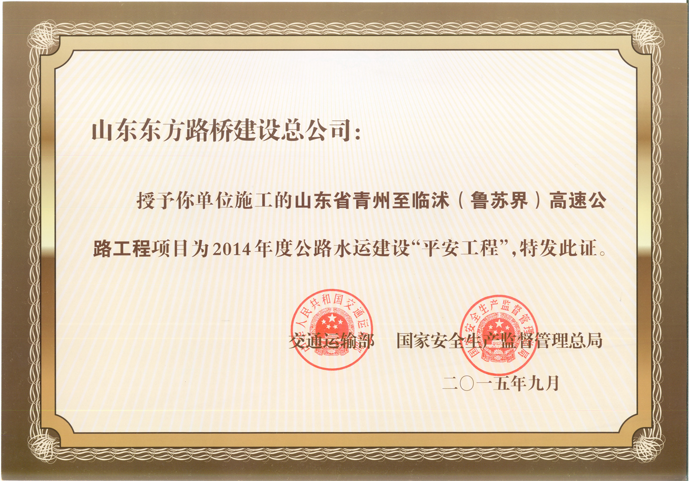山东省青州至临沭(鲁苏界)高速公路工程项目为2014年度公路水运建设“平安工程” -