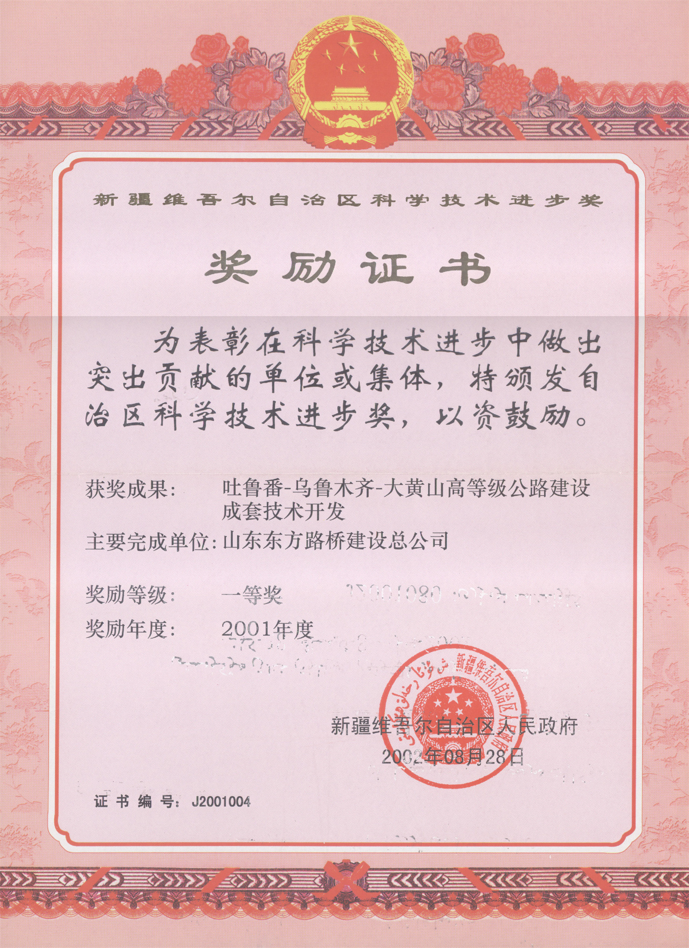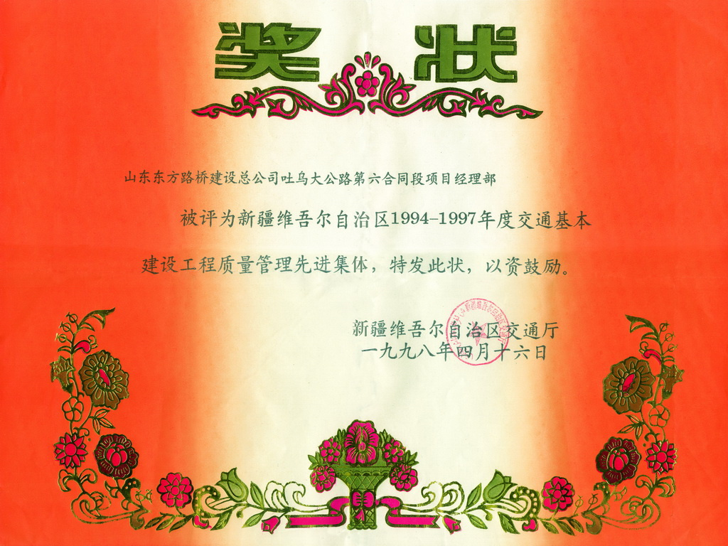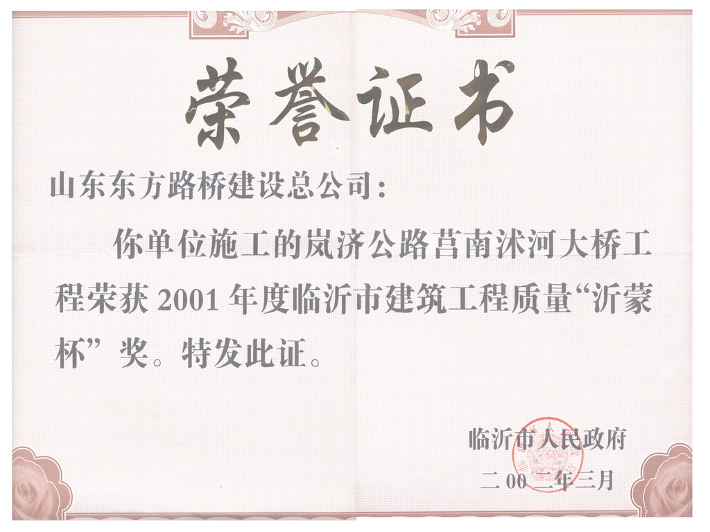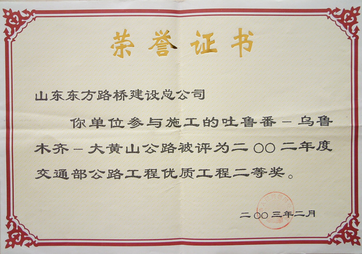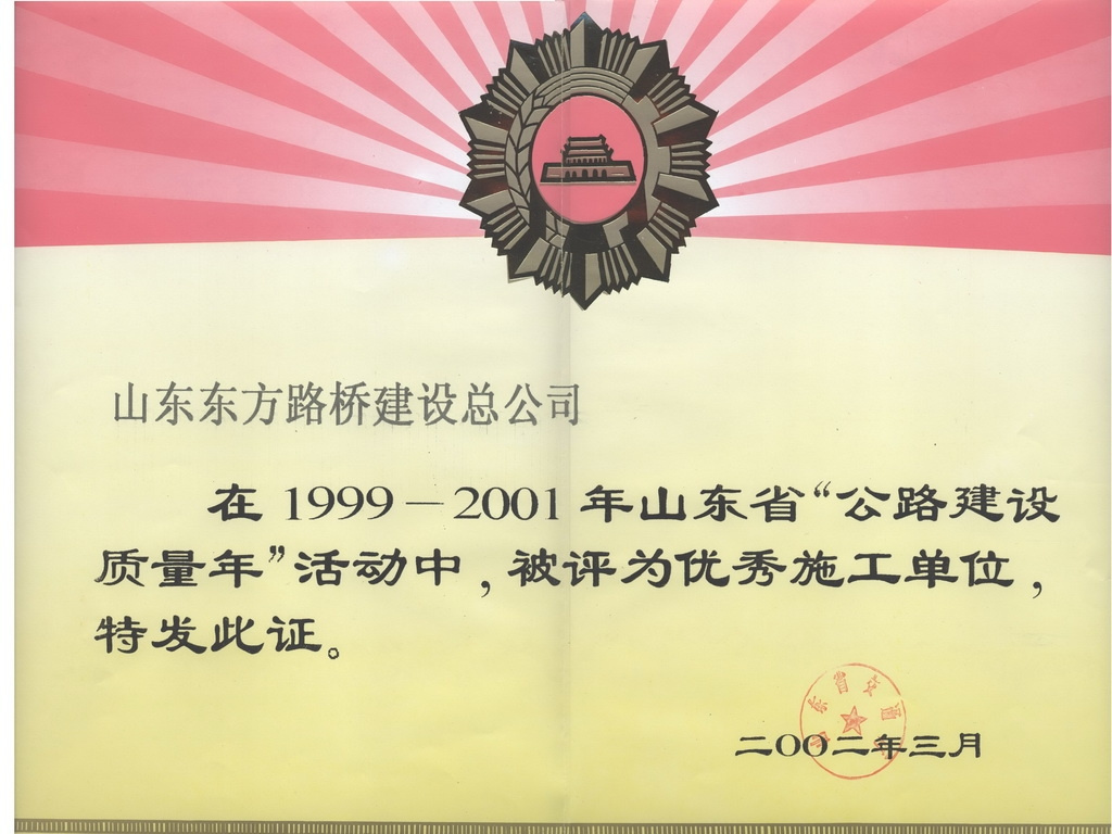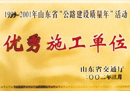 2002年,连续三年(1999年—2001年)被山东省交通厅评为“公路建设质量年活动优秀施工单位” -