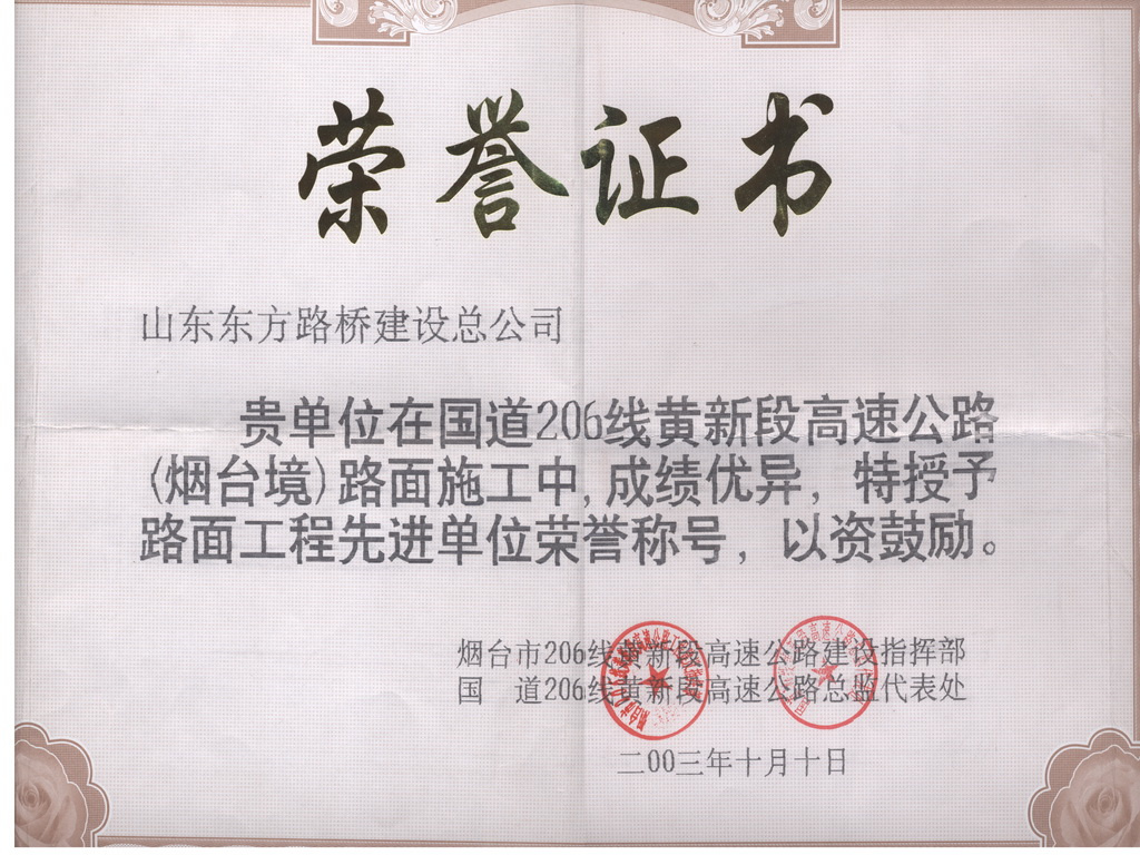 2003年,G206线黄山馆至新河段、新河至潍莱路连接线高速公路,公司承建了第七合同段,被评为路面工程先进单位荣誉称号 -