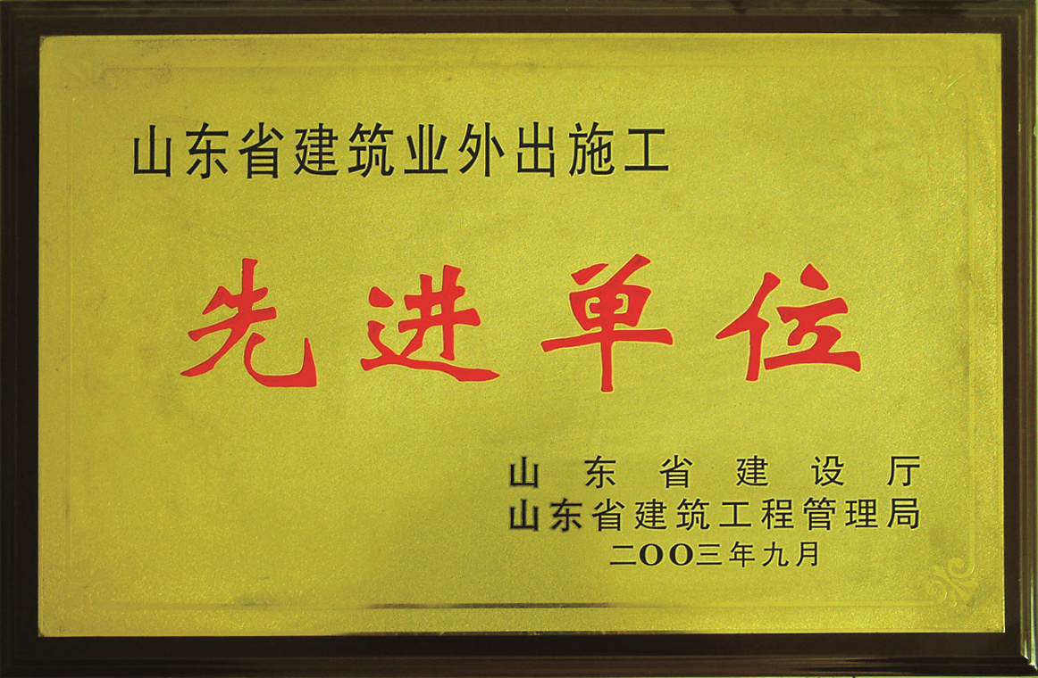 2003年,荣获山东省建设厅、山东省建筑质量工程管理局颁发的山东省建筑业外出施工“先进单位”荣誉称号 -
