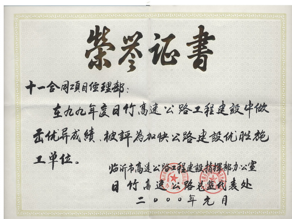 2000年,公司承建的日照至东明高速公路日照至竹园段第十、十一两个合同段,被评为加快公路建设优胜施工单位 -